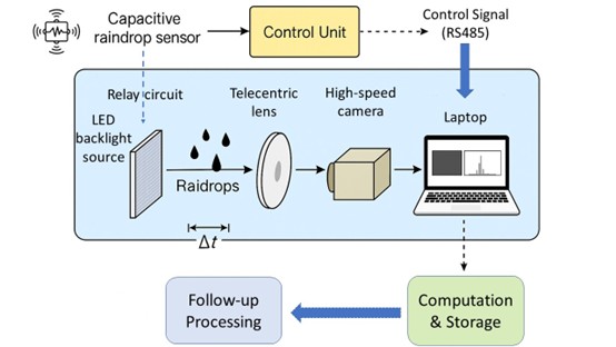 傳統觀測儀器如傾斗式雨量計 (TBRG) 無法提供微觀參數;而光學式雨滴譜儀 (如 OTT Parsivel²) 雖廣泛應用,但在強風、斜雨或非球形雨滴的觀測上存在系統性誤差。為解決上述問題,本研究開發了一套低成本、高彈性且具備抗風干擾能力的「高速影像式雨滴測量系統 (HSIV)」。