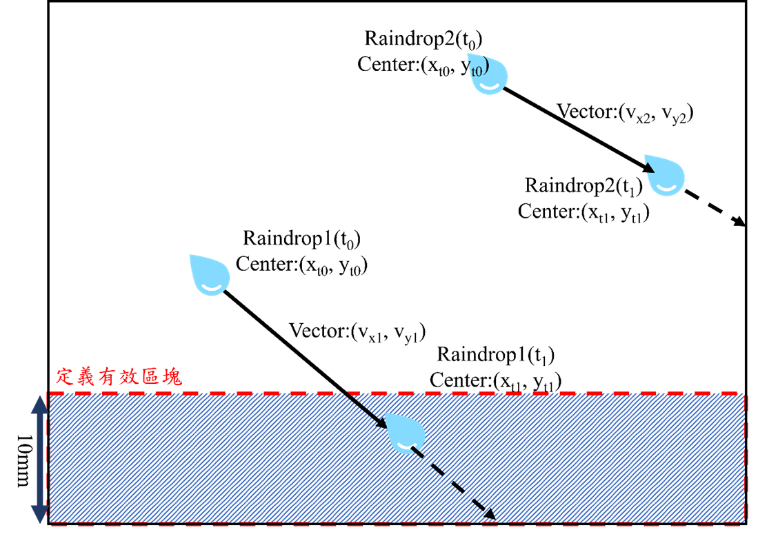 - 影像前處理與特徵萃取:利用背景相減法與 Renyi 熵濾波器去除雜訊,並針對雨滴進行橢圓擬合,獲取質心、長短軸與傾角資訊。