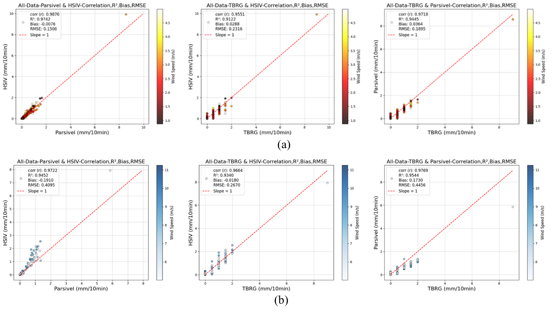 - 降雨強度一致性:HSIV 與 Parsivel² 的降雨強度相關係數 (R²) 高達 0.94 以上,證明了系統的可靠性。